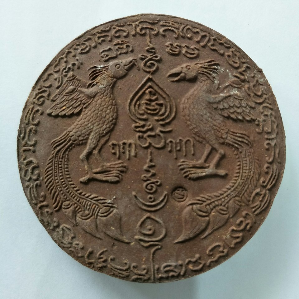 เป็นอันว่าได้ทั้งหาทรัพย์และคุ้มทรัพย์ ด้านหลังเป็นนกสาลิกาป้อนเหยื่อ นกเป็นสัตว์ที่หากินเก่งขยัน ตื่นหากินแต่เช้า จะกลับรังก็มืดค่ำ พร้อมทั้ง “ยันต์สำเภาทอง” ยันต์ประจำตัวของหลวงปู่เมฆ สจฺจาสโภ จึงเป็นอนุสติเตือนใจให้ผู้ที่วัตถุมงคลนี้ให้รู้จักสร้างฐานะ เหมือนเรือสำเภาที่ออกไปค้าขาย ล้อมรอบหน้าหลังด้วยพระคาถาบารมี 30 ฑัต