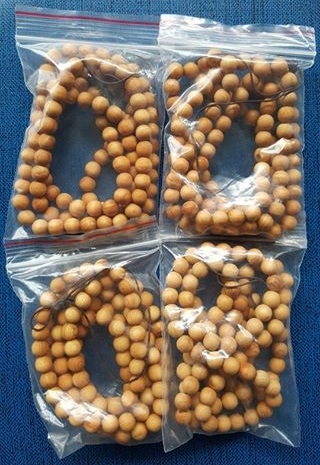 สร้อยประคำ 108 เม็ด ไม้แก่นจันทร์ หรือ ไม้จันทร์หอม ขนาดเส้นผ่านศูนย์กลาง 0.8 ซม. ความยาววัดเส้นคู่ 16.5 นิ้ว รับประกันไม้จันทร์หอม แท้ ๆ จากประเทศจีน